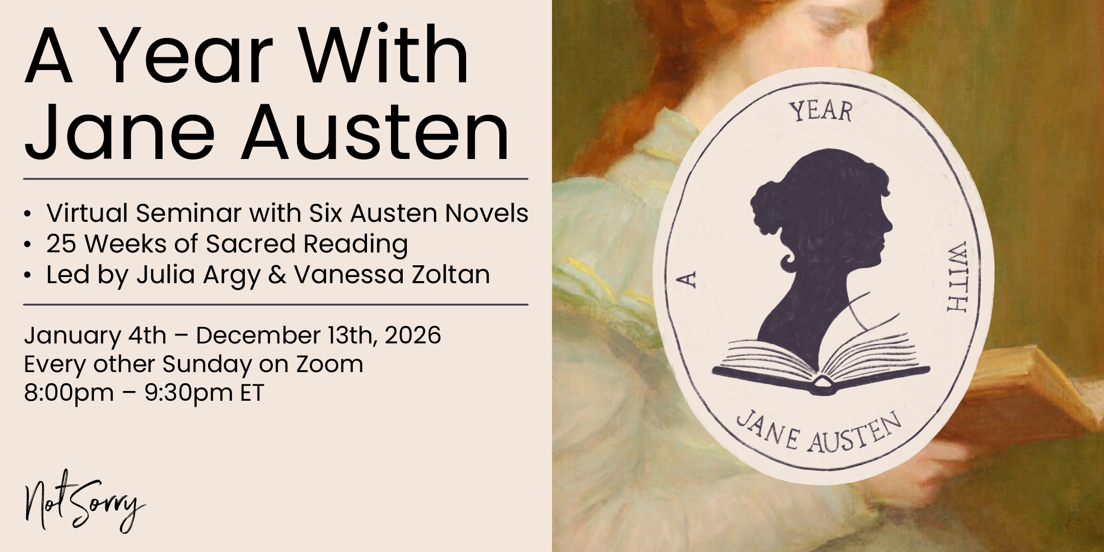 Join Vanessa Zoltan and Julia Argy for A Year with Jane Austen, a 25-week virtual seminar of sacred reading practices devoted to Austen’s entire novel canon. With a community of fellow readers meeting every other Sunday, students will dive into Austen’s universe, observing how characters Austen so deftly inform one another.
